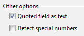 These options determine whether quoted data will always be imported as text, and whether OpenOffice.org Calc will automatically detect all number formats, including special number formats such as dates, time, and scientific notation. The detection depends on the language settings.
